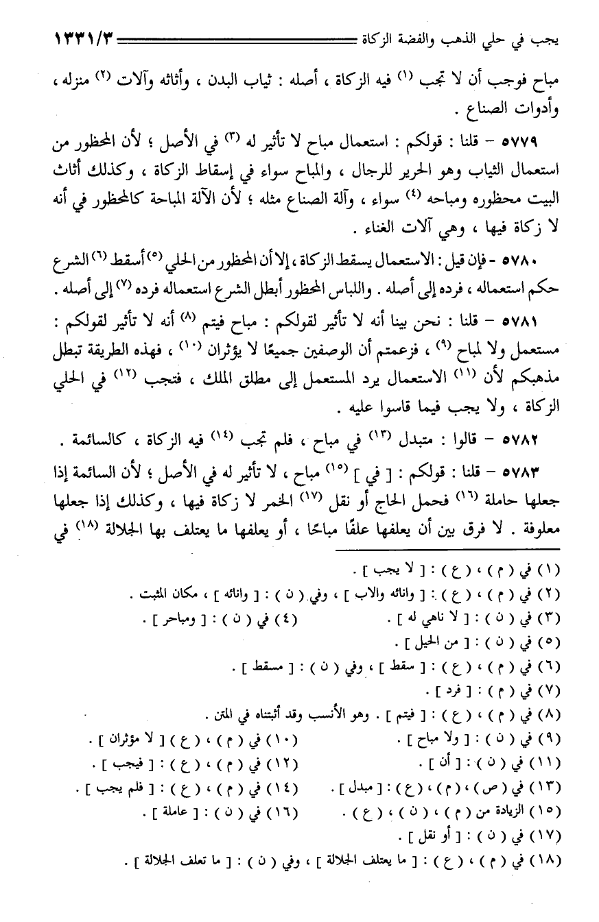 5779 - قلنا: قولكم: استعمال مباح لا تأثير له في الأصل؛ لأن المحظور من استعمال الثياب وهو الحرير للرجال، والمباح سواء في إسقاط الزكاة، وكذلك أثاث البيت محظوره ومباحه سواء، وآلة الصناع مثله؛ لأن الآلة المباحة كالمحظور في أنه لا زكاة فيها، وهي آلات الغناء.