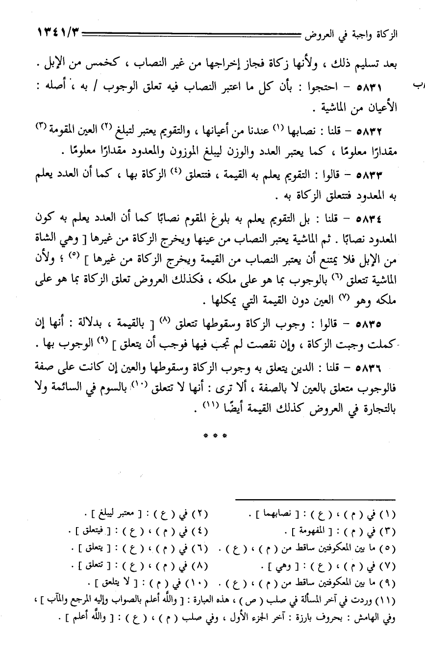 5832 - قلنا: نصابها عندنا من أعيانها، والتقويم يعتبر لتبلغ العين المقومة مقدارا معلوما، كما يعتبر العدد والوزن ليبلغ الموزون والمعدود مقدارا معلوما.
