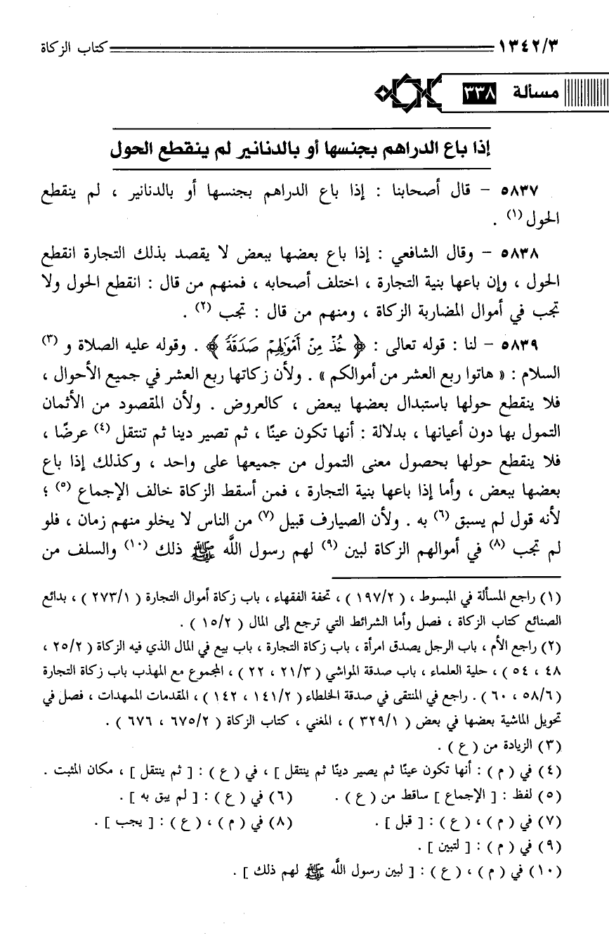 5837 - قال أصحابنا: إذا باع الدراهم بجنسها أو بالدنانير، لم ينقطع الحول.