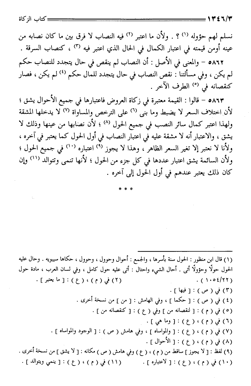 نسلم لهم حؤوله؟. ولأن ما اعتبر فيه النصاب لا فرق بين ما كان نصابه من عينه أو من قيمته في اعتبار الكمال في الحال الذي اعتبر فيه، كنصاب السرقة.