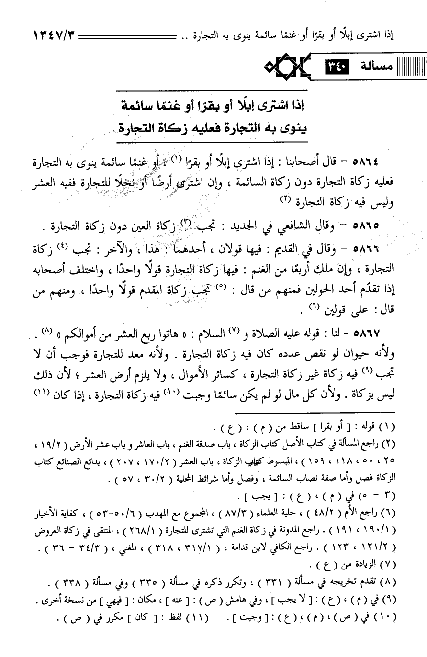 5864 - قال أصحابنا: إذا اشترى إبلا أو بقرا، أو غنما سائمة ينوى به التجارة فعليه زكاة التجارة فعليه زكاة التجارة دون زكاة السائمة، وإن اشترى أرضا أو نخلا للتجارة ففيه العشر وليس فيه زكاة التجارة.