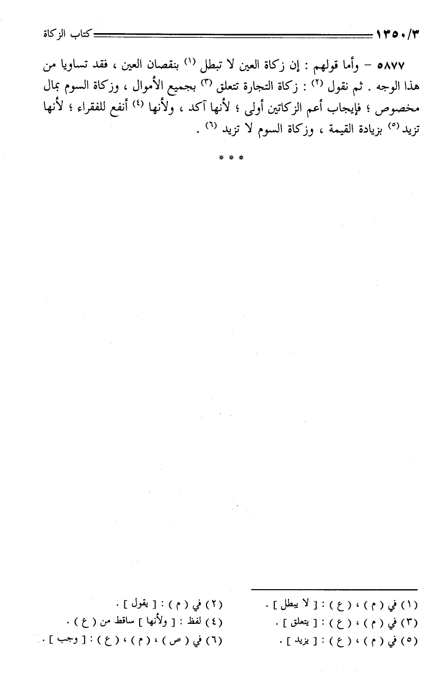 5877 - وأما قولهم: إن زكاة العين لا تبطل بنقصان العين، فقد تساويا من هذا الوجه. ثم نقول: زكاة التجارة تتعلق بجميع الأموال، وزكاة السوم بمال مخصوص؛ فإيجاب أعم الزكاتين أولى؛ لأنها آكد، ولأنها أنفع للفقراء؛ لأنها تزيد بزيادة القيمة، وزكاة السوم لا تزيد.