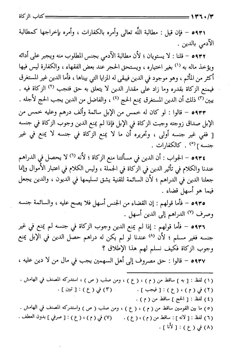 5933 - قالوا: لو كان له خمس من الإبل سائمة وألف درهم وعليه خمس من الإبل صداق زوجته وجبت الزكاة في الإبل فإذا لم يمنع الدين وجوب الزكاة في جنسه [ففي غير جنسه أولى، وتحريره أن ما لا يمنع الزكاة في جنسه لا يمنع في غير جنسه]. كالكفارات.
