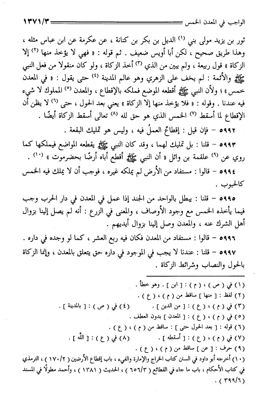 5597 - قلنا: عندنا لا يجب في الموجود في داره حق يتعلق بالمعدن، وإنما الزكاة بالحول والنصاب وشرائط الزكاة.
