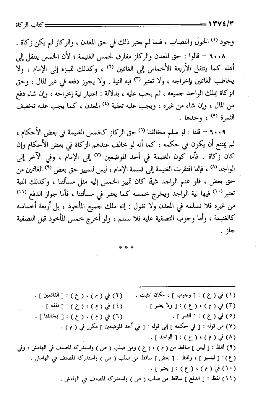 6009 - قلنا: لو سلم مخالفنا حق الركاز كخمس الغنيمة في بعض الأحكام، لم يمتنع أن يكون في حكمه، كما أنه لو خالف عندهم الزكاة في بعض الأحكام وإن كان زكاة. فأما كون الغنيمة في أحد الموضعين إلى الإمام، وفي الآخر إلى الواجد، فإنما افتقرت الغنيمة إلى قسمة الإمام، ليس لتمييز حق بعض الغانمين من حق بعض، فلو غنم الواجد شيئا كان تمييز الخمس إليه مثل مسألتنا، وكذلك النية تعتبر فيها نية الواجد ويخرج خمسه كما يعتبر في مسألتنا، فأما جواز الدفع من غيره فلا نسلمه في المعدن ولا نقول: إنه ملك جميع المأخوذ، بل أربعة أخماسه كالغنيمة، وأما وجوب التصفية عليه فلا نسلم، ولو أخرج خمس المأخوذ قبل التصفية جاز.