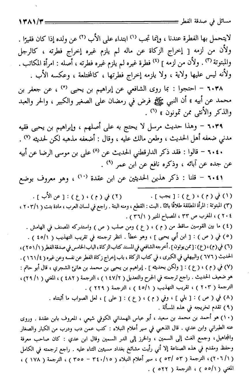 6038 - احتجوا: بما روى الشافعي عن إبراهيم بن يحيى، عن جعفر بن محمد عن أبيه) أن النبي - صلى الله عليه وسلم - فرض في رمضان على الصغير والكبير، والحر والعبد والذكر والأنثى ممن تمونون).