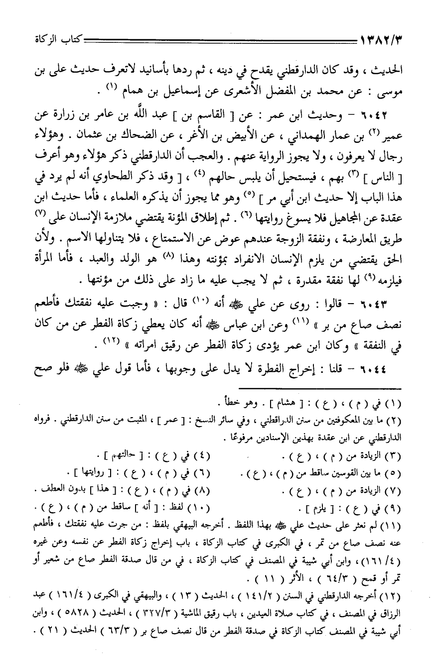 6043 - قالوا: روي عن علي - رضي الله عنه - أنه قال: (وجبت عليه نفقتك فأطعم نصف صاع من بر) وعن ابن عباس - رضي الله عنه - أنه كان يعطي زكاة الفطر عن من كان في النفقة) وكان ابن عمر يؤدي زكاة الفطر عن رقيق امرأته).
