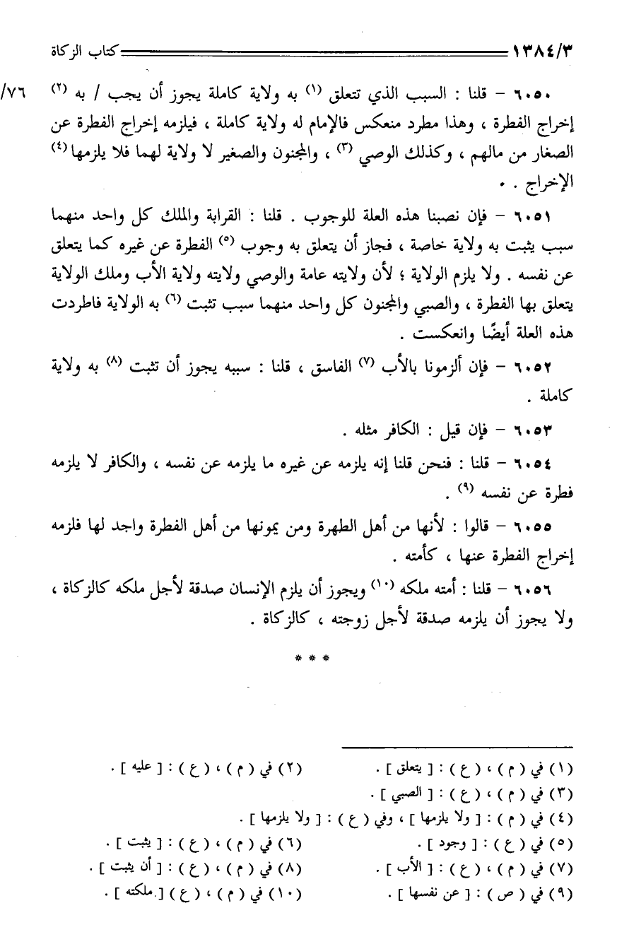 6050 - قلنا: السبب الذي تتعلق به ولاية كاملة يجوز أن يجب به إخراج الفطرة، وهذا مطرد منعكس فالإمام له ولاية كاملة، فيلزمه إخراج الفطرة عن الصغار من مالهم، وكذلك الوصي، والمجنون والصغير لا ولاية لهما فلا يلزمها الإخراج.