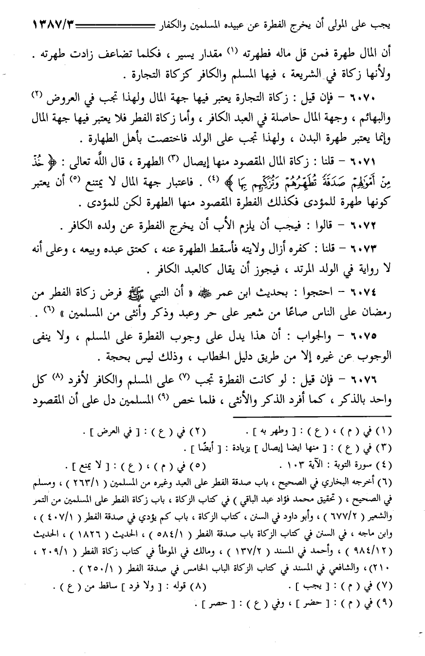 6075 - والجواب: أن هذا يدل على وجوب الفطرة على المسلم، ولا ينفى الوجوب عن غيره إلا من طريق دليل الخطاب، وذلك ليس بحجة.