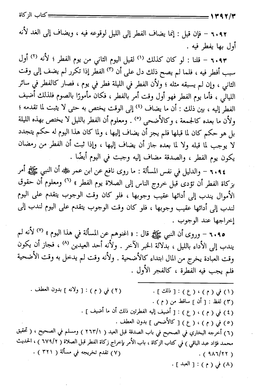 6094 - والدليل في نفس المسألة: ما روى نافع عن ابن عمر - رضي الله عنه - أن النبي - صلى الله عليه وسلم - أمر بزكاة الفطر أن تؤدى قبل خروج الناس إلى الصلاة يوم الفطر) ومعلوم أن حقوق الأموال يندب إلى أدائها عقيب وجوبها، فلو كان وقت الوجوب يتقدم على اليوم لندب إلى أدائها عقيب وجوبها، فلو كان وقت الوجوب يتقدم على اليوم لندب إلى إخراجها عند الوجوب.