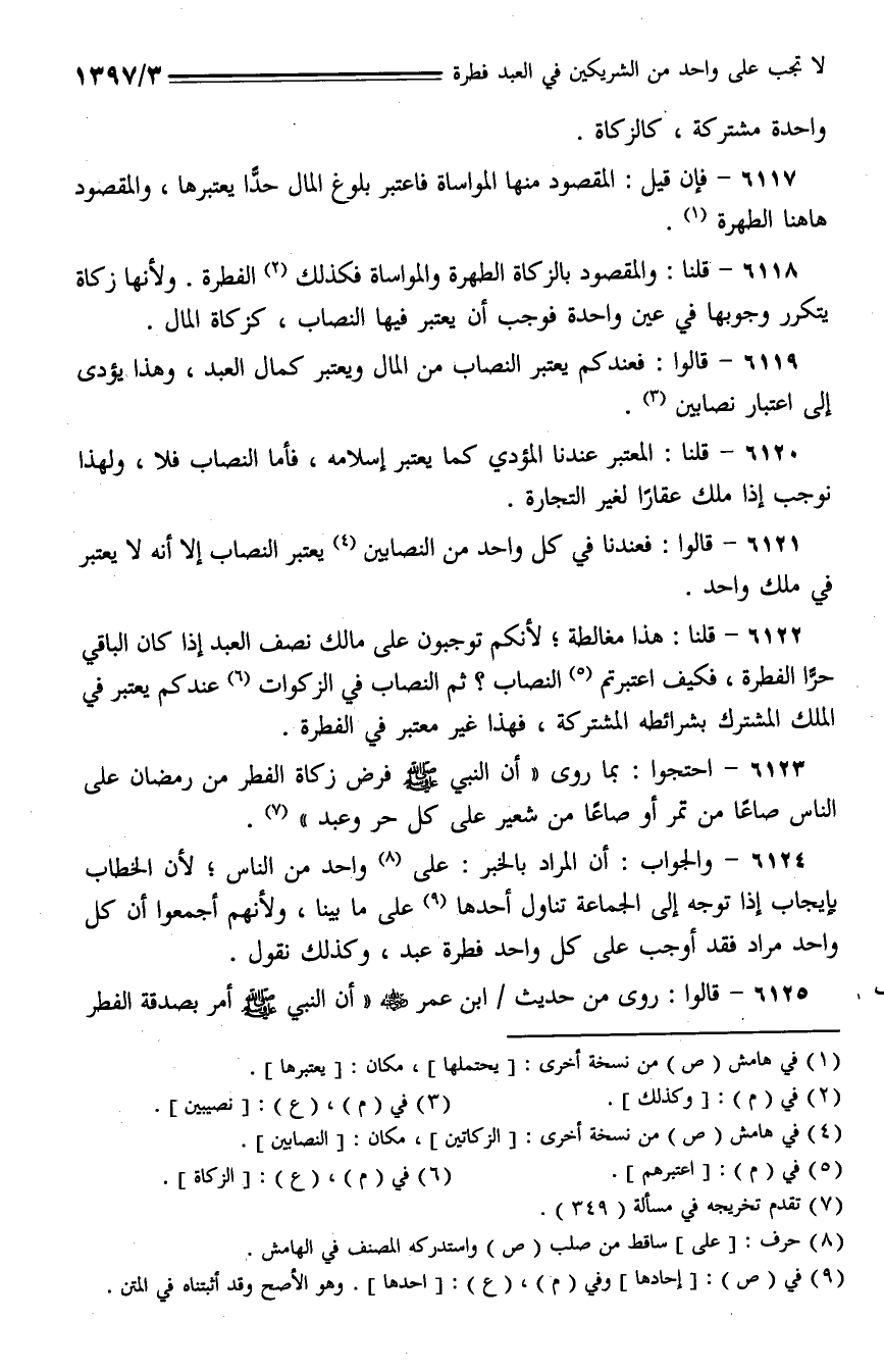 6118 - قلنا: والمقصود بالزكاة الطهرة والمواساة فكذلك الفطرة. ولأنها زكاة يتكرر وجوبها في عين واحدة فوجب أن يعتبر فيها النصاب, كزكاة المال.