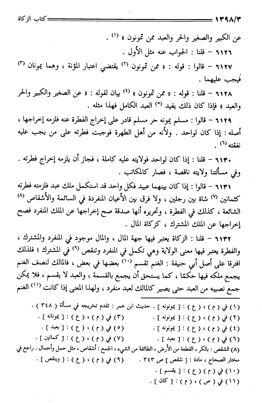 6131 - قالوا: إذا كان بينهما عبيد فكل واحد قد استكمل ملك عبد فلزمته فطرته كثمانين شاة بين رجلين, ولا فرق بين الأعيان المنفردة في السائمة والأشقاص الشائعة, كذلك في الفطرة, وتحريره أنها صدقة صح إخراجها عن الملك المنفرد فصح إخراجها عن الملك المشترك, كزكاة المال.