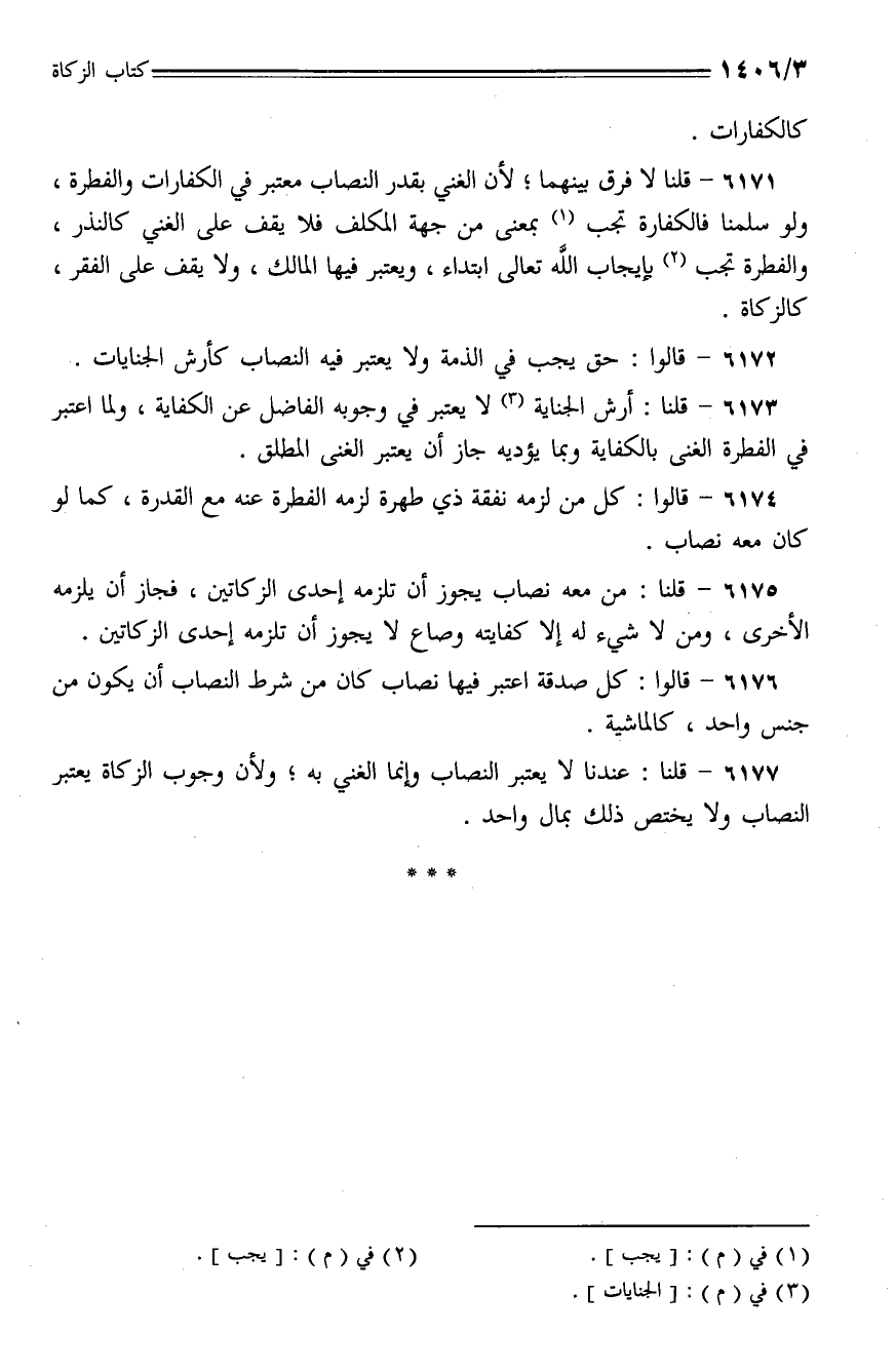 6177 - قلنا: عندنا لا يعتبر النصاب وإنما الغني به؛ ولأن وجوب الزكاة يعتبر النصاب ولا يختص ذلك بمال واحد.