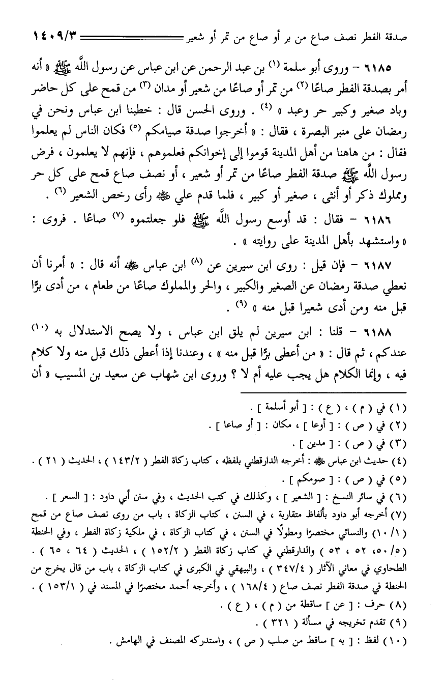 6185 - وروى أبو سلمة بن عبد الرحمن عن ابن عباس عن رسول الله - صلى الله عليه وسلم - (أنه أمر بصدقة الفطر صاعا من تمر أو صاعا من شعير أو مدان من قمح على كل حاضر وباد صغير وكبير حر وعبد). وروى الحسن قال: خطبنا ابن عباس ونحن في رمضان على منبر البصرة, فقال: (أخرجوا صدقة صيامكم فكان الناس لم يعلموا فقال: من هاهنا من أهل المدينة قوموا إلى إخوانكم فعلموهم, فإنهم لا يعلمون, فرض رسول الله - صلى الله عليه وسلم - صدقة الفطر صاعا من تمر أو شعير, أو نصف صاع قمح على كل حر ومملوك ذكر أو أنثى, صغير أو كبير, فلما قدم علي - رضي الله عنه - رأى رخص الشعير.