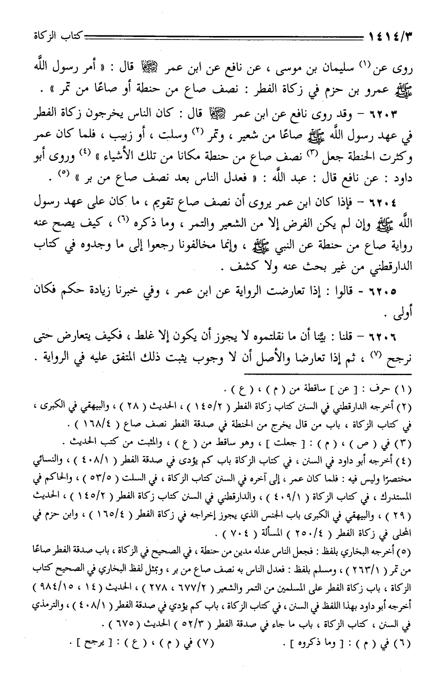 6203 - وقد روى نافع عن ابن عمر - رضي الله عنه - قال: كان الناس يخرجون زكاة الفطر في عهد رسول الله - صلى الله عليه وسلم - صاعا من شعير, وتمر وسلت, أو زبيب, فلما كان عمر وكثرت الحنطة جعل نصف صاع من حنطة مكانا من تلك الأشياء) وروى أبو داود: عن نافع قال: عبد الله: (فعدل الناس بعد نصف صاع بر).