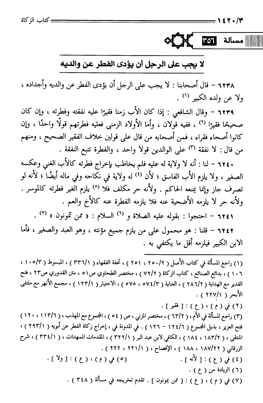 6238 - قال أصحابنا: لا يجب علي الرجل أن يؤدي الفطر عن والديه وأجداده, ولا عن ولده الكبير.