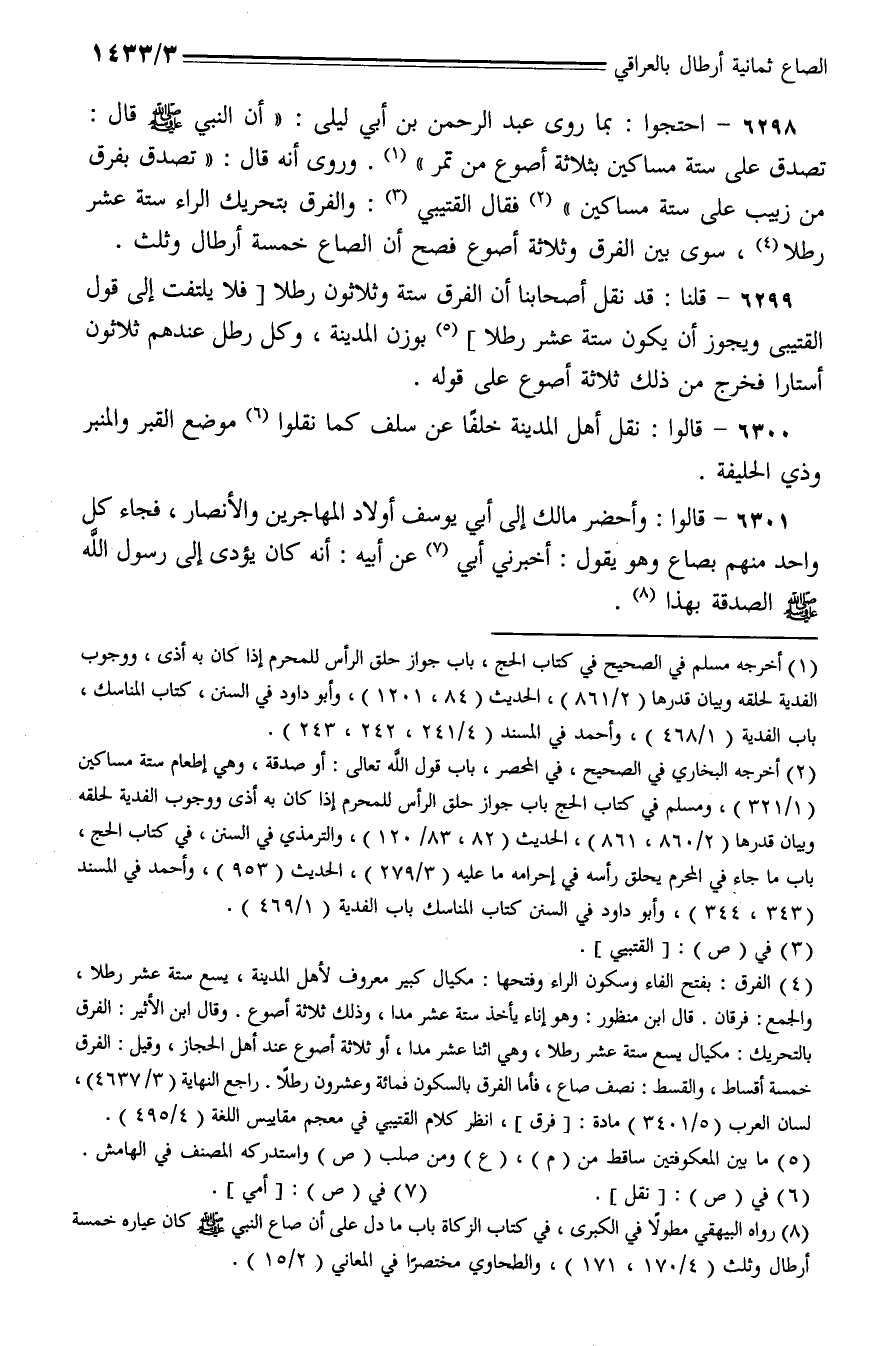 6298 - احتجوا: بما روى عبد الرحمن بن أبي ليلى: (أن النبي - صلى الله عليه وسلم - قال: تصدق على ستة مساكين بثلاثة أصوع من تمر). وروى أنه قال: (تصدق بفرق من زبيب على ستة مساكين) فقال القتيبي: والفرق بتحريك الراء ستة عشر رطلا, سوى بين الفرق وثلاثة أصوع فصح أن الصاع خمسة أرطال وثلث.