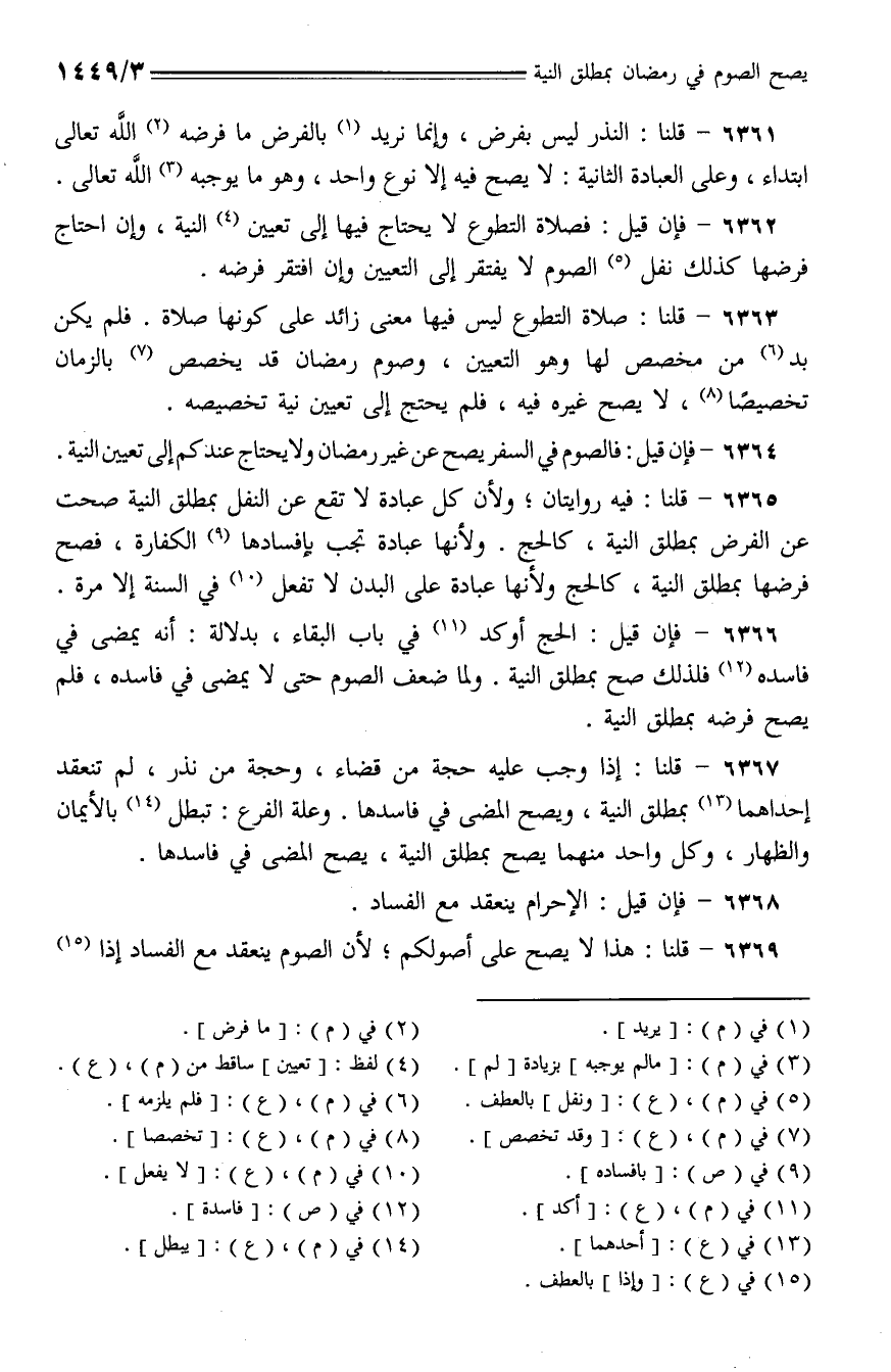 6365 - قلنا: فيه روايتان؛ ولأن كل عبادة لا تقع عن النفل بمطلق النية صحت عن الفرض بمطلق النية، كالحج. ولأنها عبادة تجب بإفسادها الكفارة، فصح فرضها بمطلق النية، كالحج ولأنها عبادة على البدن لا تفعل في السنة إلا مرة.