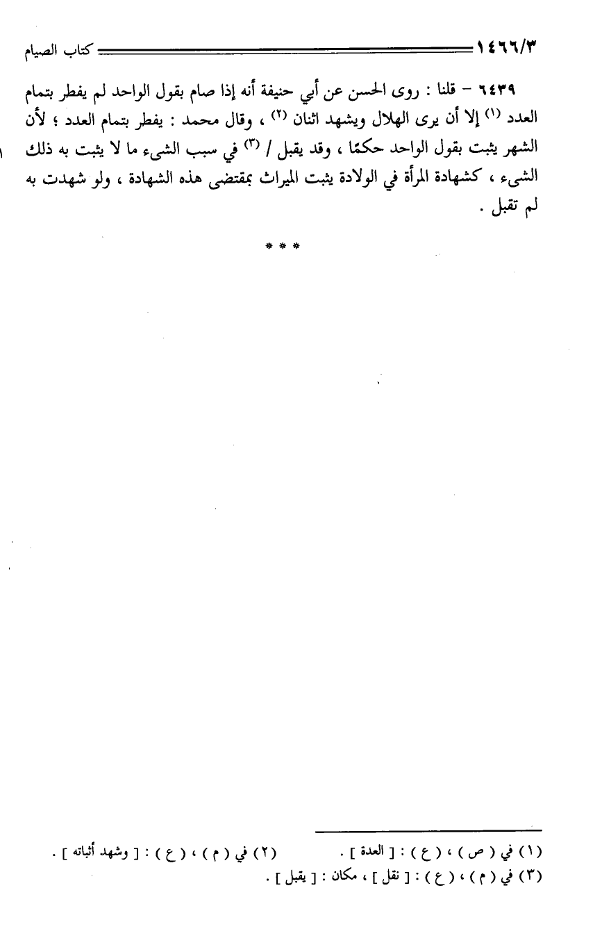 6439 - قلنا: روى الحسن عن أبي حنيفة أنه إذا صام بقول الواحد لم يفطر بتمام العدد إلا أن يرى الهلال ويشهد اثنان، وقال محمد: يفطر بتمام العدد؛ لأن الشهر يثبت بقول الواحد حكما، وقد يقبل في سبب الشيء ما لا يثبت به ذلك الشيء، كشهادة المرأة في الولادة يثبت الميراث بمقتضى هذه الشهادة، ولو شهدت به لم تقبل.