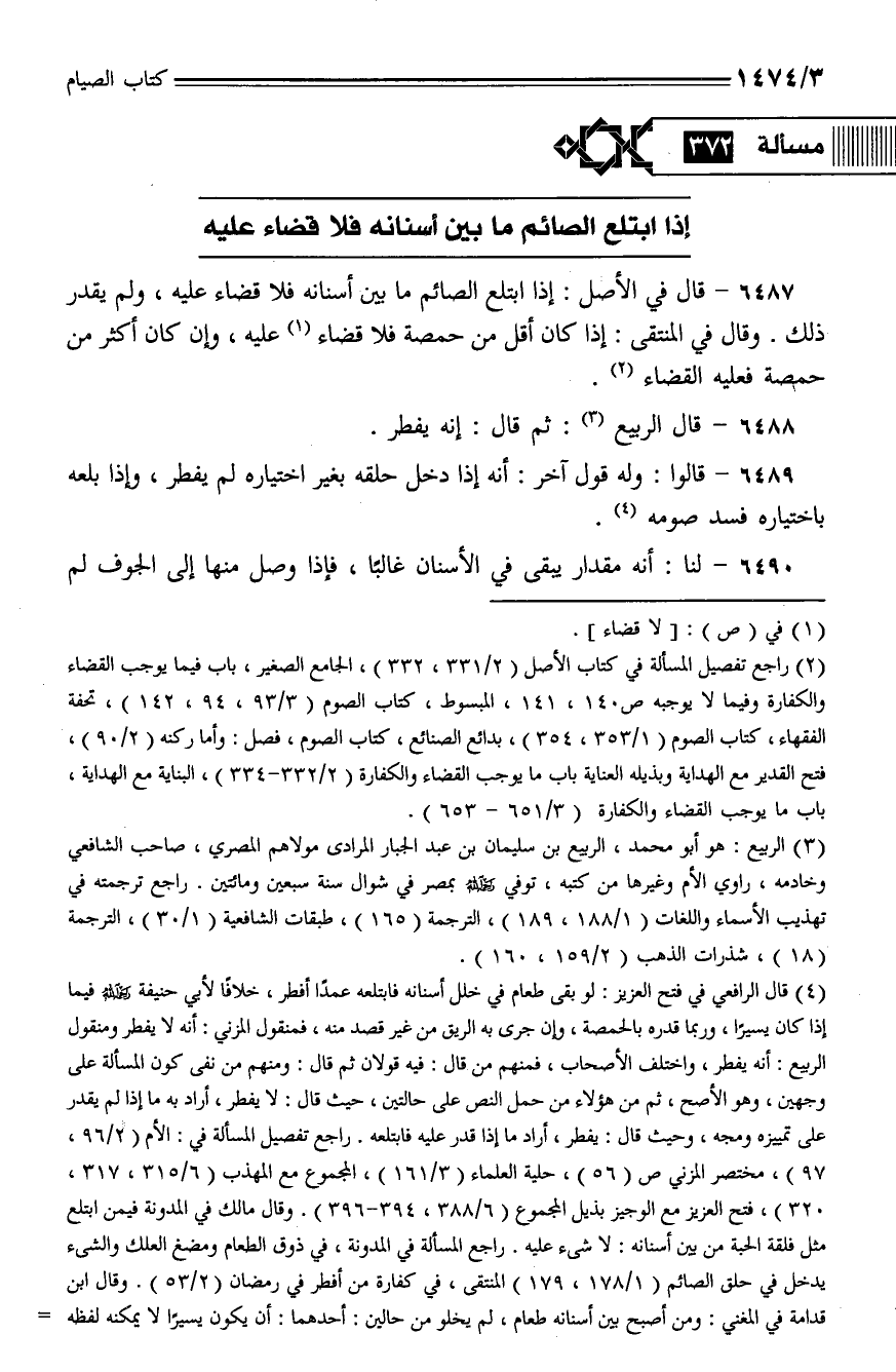 6487 - قال في الأصل: إذا ابتلع الصائم ما بين أسنانه فلا قضاء عليه، ولم يقدر ذلك. وقال في المنتقى: إذا كان أقل من حمصة فلا قضاء عليه، وإن كان أكثر من حمصة فعليه القضاء.