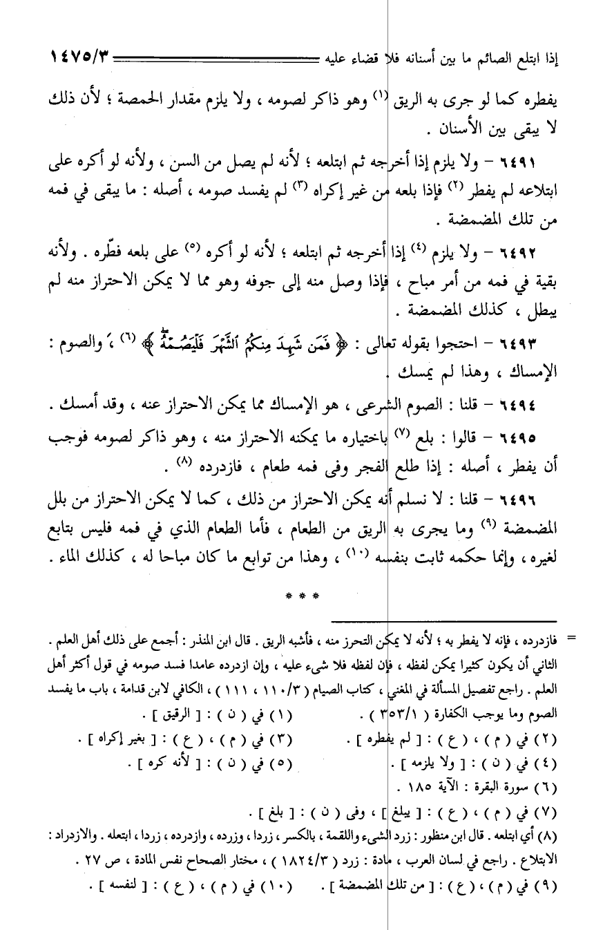 6495 - قالوا: بلع باختياره ما يمكنه الاحتراز منه، وهو ذاكر لصومه فوج أن يفطر، أصله: إذا طلع الفجر وفي فمه طعام، فازدرده.