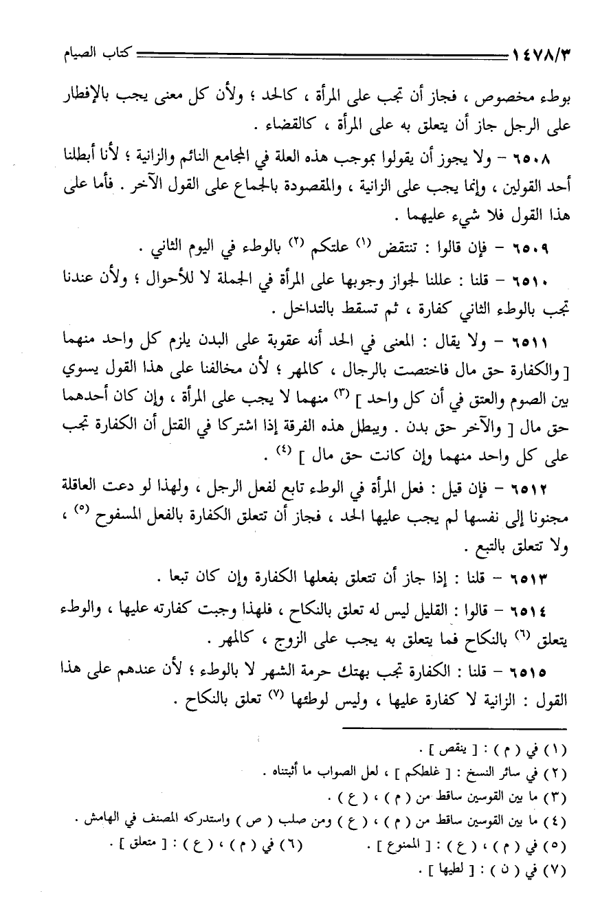 6510 - قلنا: عللنا لجواز وجوب على المرأة في الجملة لا للأحوال؛ ولأن عندنا تجب بالوطء الثاني كفارة، ثم تسقط بالتداخل.