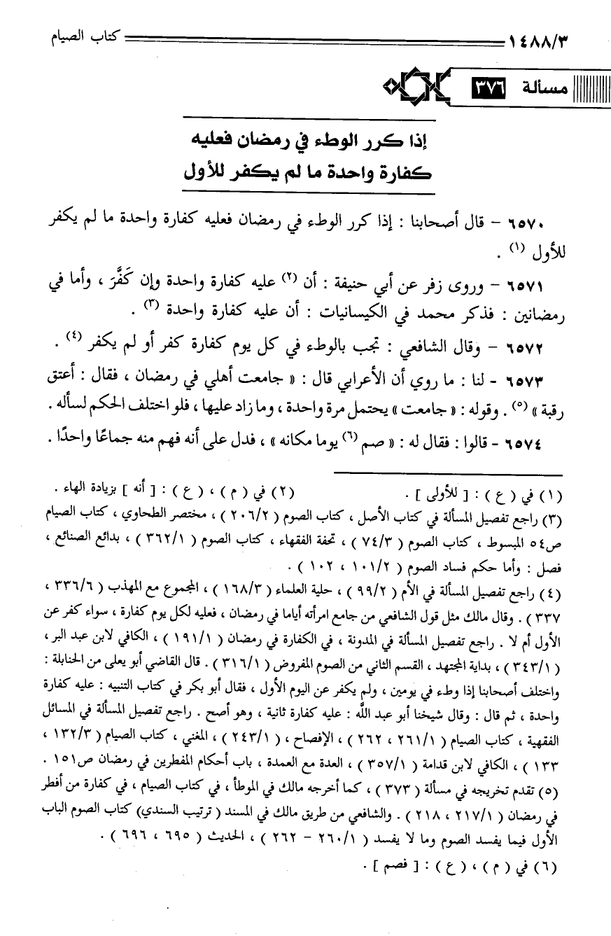 6570 - قال أصحابنا: إذا كرر الوطء في رمضان فعليه كفارة واحدة ما لم يكفر للأول.