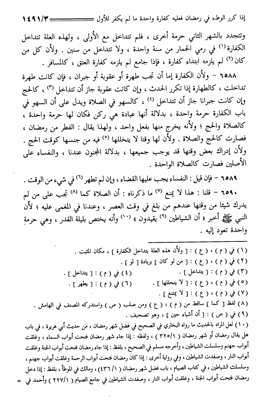 6588 - ولأن الكفارة إما أن تجب طهرة أو عقوبة أو جبران، فإن كانت طهرة تداخلت، كالطهارة إذا تكرر الحدث، وإن كانت عقوبة جاز أن تتداخل، كالحج وإن كانت جبرانا جاز أن تتداخل، كالسهو في الصلاة ويدل على أن السهو في باب الكفارة حرمة واحدة، بدلالة أنها عبادة هي ركن فكان لها حرمة واحدة، كالصلاة والحج؛ ولأنه يخرج منها بفعل واحد، ولهذا يقال: الفطر من رمضان، فصارت كالحج والصلاة. ولأن لها وقتا لا يتخللها فيه من جنسها كوقت الحج. ولأن إدراك بعض وقتها قد يوجب جميعها، بدلالة المجنون عندنا، والنفساء على الأصلين فصارت كالصلاة واحدة.