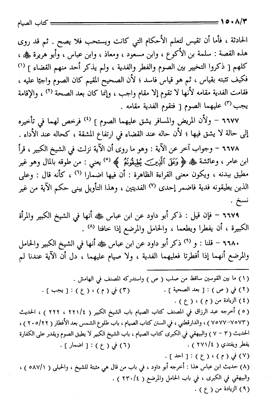 6680 - قلنا: وذكر أبو داود عن ابن عباس - رضي الله عنه - أنها في الشيخ الكبير والحامل والمرضع أنهما إذا أفطرتا فعليهما الفدية، ولا صيام عليهما، دل أن الآية عندنا لم