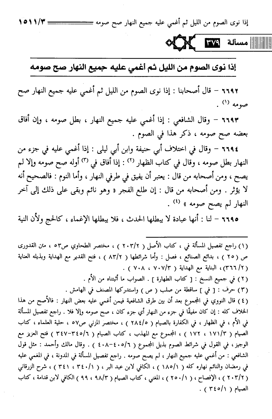 6694 - وقال في اختلاف أبي حنيفة وابن أبي ليلى: إذا أغمى عليه في جزء من النهار بطل صومه، وقال في كتاب الظهار: إذا أفاق في طرفي النهار، وأما النوم: فالصحيح أنه لا يؤثر. ومن أصحابه من قال: إن طلع الفجر (وهو نائم وبقى على ذلك إلى آخر النهار لم يصح صومه).