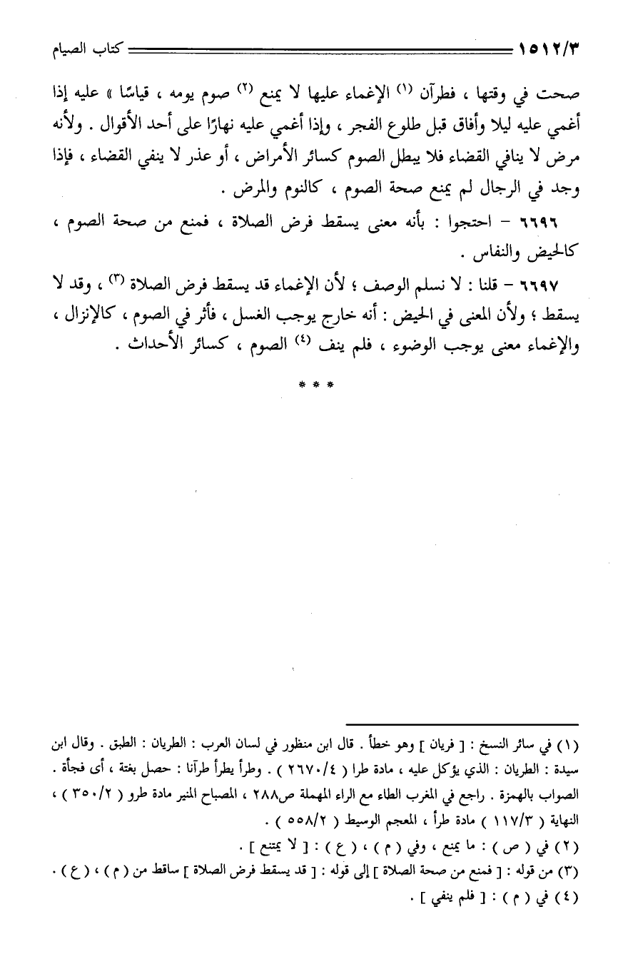6697 - قلنا: لا نسلم الوصف؛ لأن الإغماء؛ لأن الإغماء قد يسقط فرض الصلاة، وقد لا يسقط؛ ولأن المعنى في الحيض: أنه خارج يوجب الغسل، فأثر في الصوم، كالإنزال، والإغماء معنى يوجب الوضوء، فلم ينف الصوم، كسائر الأحداث.
