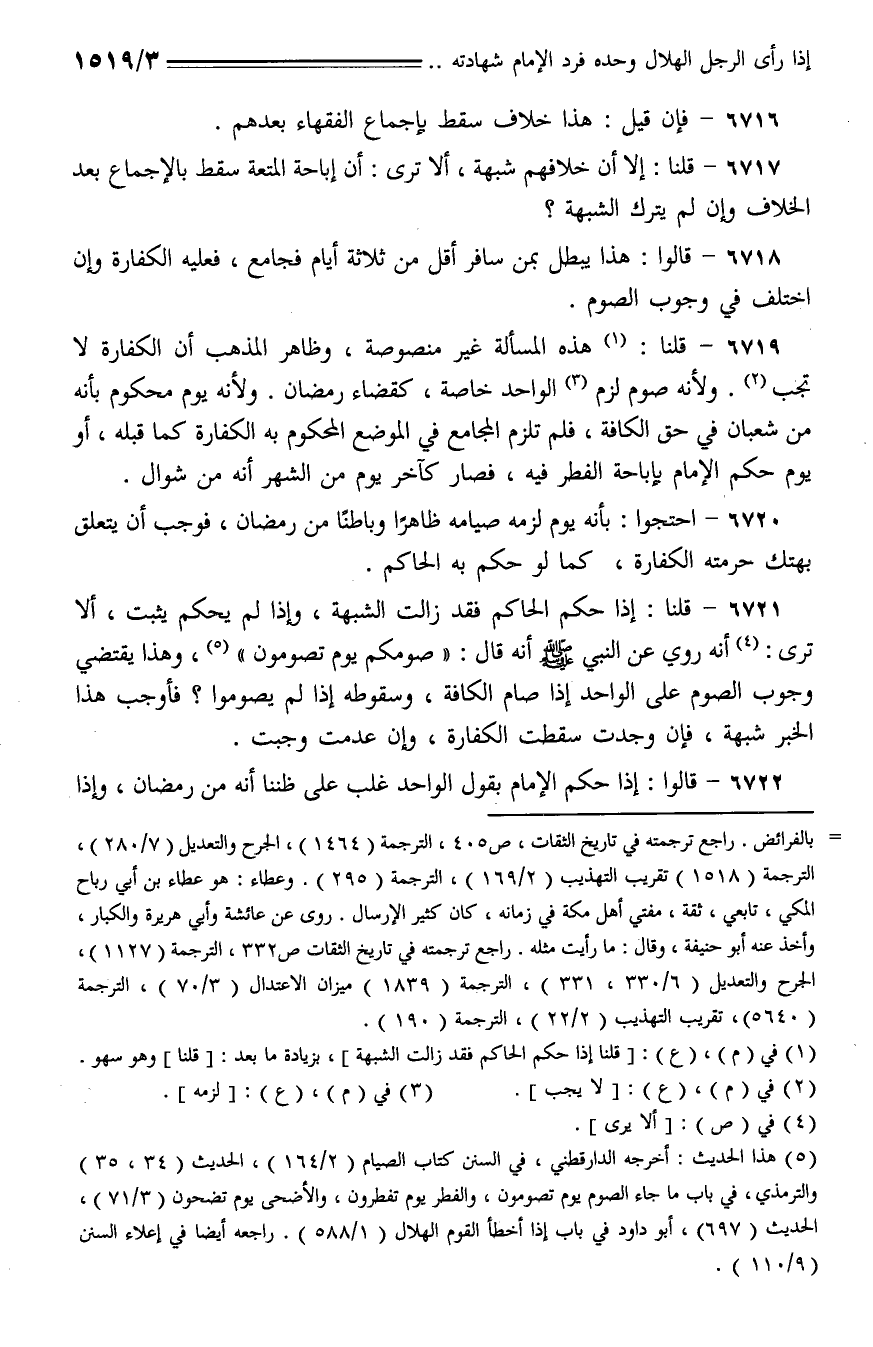6721 - قلنا: إذا حكم الحاكم فقد زالت الشبهة، وإذا لم يحكم بثبت، ألا ترى: أنه روي عن النبي - صلى الله عليه وسلم - أنه قال: (صومكم يوم تصومون)، وهذا يقتضي وجوب الصوم على الواحد إذا صام الكافة، وسقوطه إذا لم يصوموا؟ فأوجب هذا الخبر شبهة، فإن وجدت سقطت الكفارة، وإن عدمت وجبت.