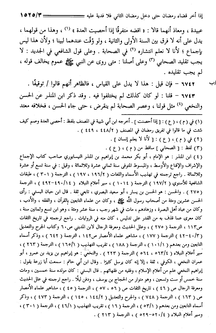 عبيدة، ومعاذ أنهما قالا: (اقضه متفرقا إذا أحصيت العدة)، وهذا من قولهما، يدل على أنه لا فرق بين السنة الأولى والثانية، ولو وقت عندهما لبينا؛ ولأن هذا ليس بإجماع؛ لأنا لا نعلم انتشاره في الصحابة. وعلى قول الشافعي في الجديد: لا يجب تقليد الصحابي وعلى أصلنا: متى روي عن النبي - صلى الله عليه وسلم - عموم يخالف قوله، لم يجب تقليده.