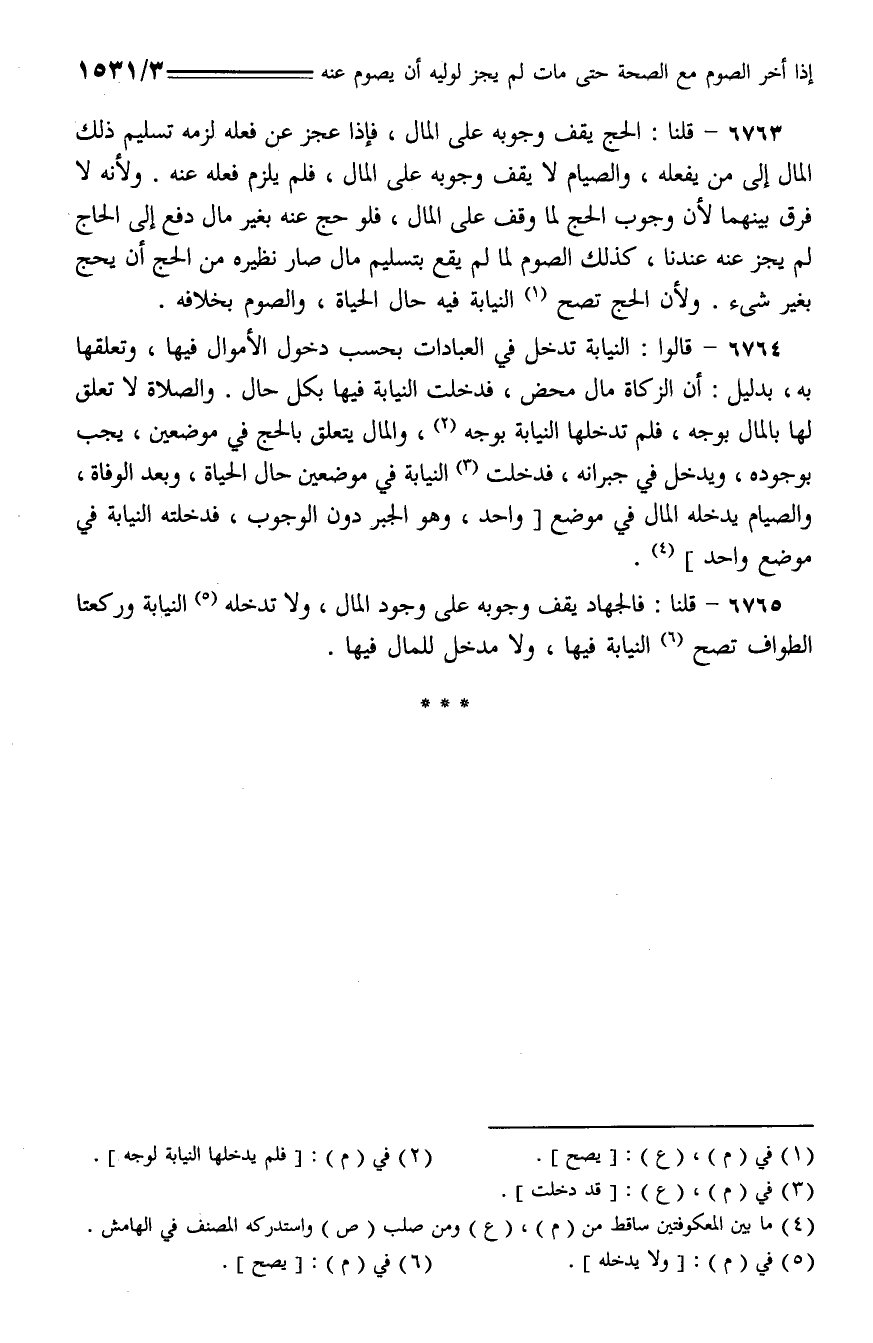 6764 - قالوا: النيابة تدخل في العبادات بحسب دخول الأموال فيها، وتعلقها به، بدليل: أن الزكاة مال محض، فدخلت النيابة فيها بكل حال. والصلاة لا تعلق لها بالمال بوجه، فلم تدخلها النيابة بوجه، والمال يتعلق بالحج في موضعين، يجب بوجوده، ويدخل في جبرانه، فدخلت النيابة في موضعين حال الحياة، وبعد الوفاة، والصيام يدخله المال في موضع [واحد، وهو الجبر دون الوجوب، فدخلته النيابة في موضع واحد].