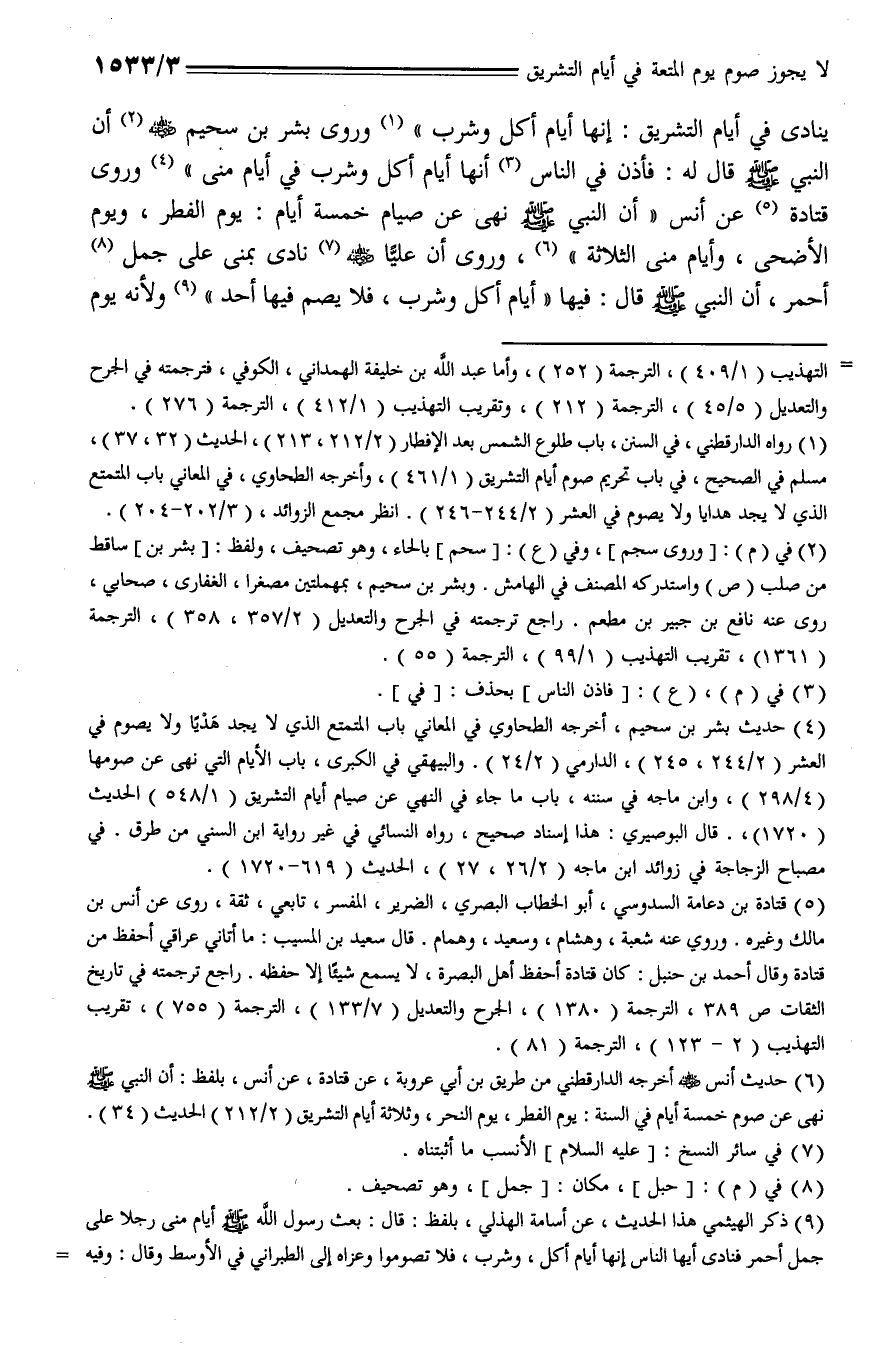 ينادي في أيام التشريق: إنها أيام أكل وشرب) رورى بشر بن سجيم - رضي الله عنه - أن النبي - صلى الله عليه وسلم - قال له: فأذن في الناس أنها أيام أكل وشرب في أيام منى) وروى قتادة عن أنس (أن النبي - صلى الله عليه وسلم - نهى عن صيام خمسة أيام: يوم الفطر، ويوم الأضحى، وأيام منى الثلاثة)، وروى أن عليا - رضي الله عنه - نادى بمنى على جمل أحمر، أن النبي - صلى الله عليه وسلم - قال: فيها (أيام أكل وشرب، فلا يصم فيها أحد) ولأنه يوم