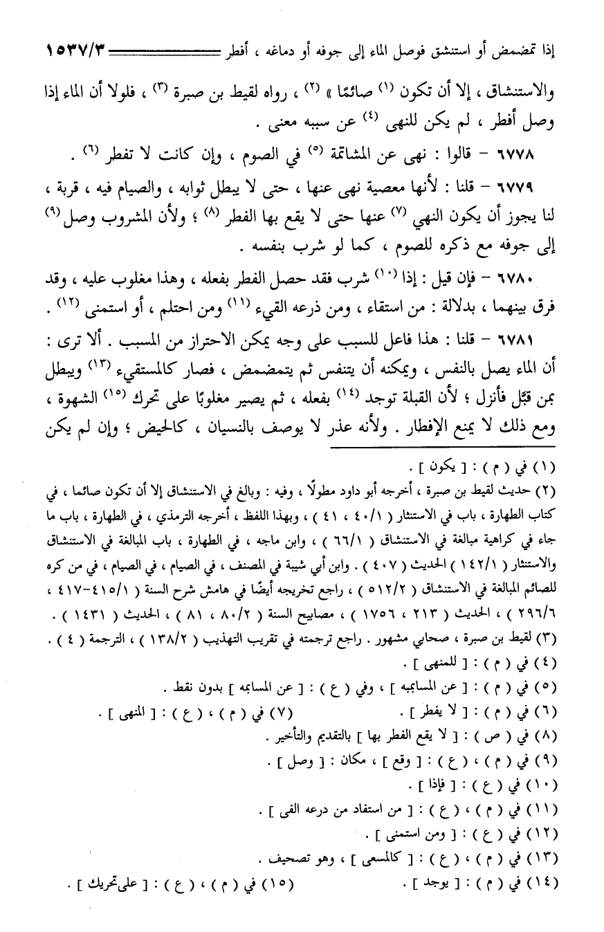 6780 - فإن قيل: إذا شرب فقد حصل الفطر بفعله، وهذا مغلوب عليه، وقد فرق بينهما، بدلالة: من استقاء، ومن ذرعه القيء ومن احتلم، أو استمنى.