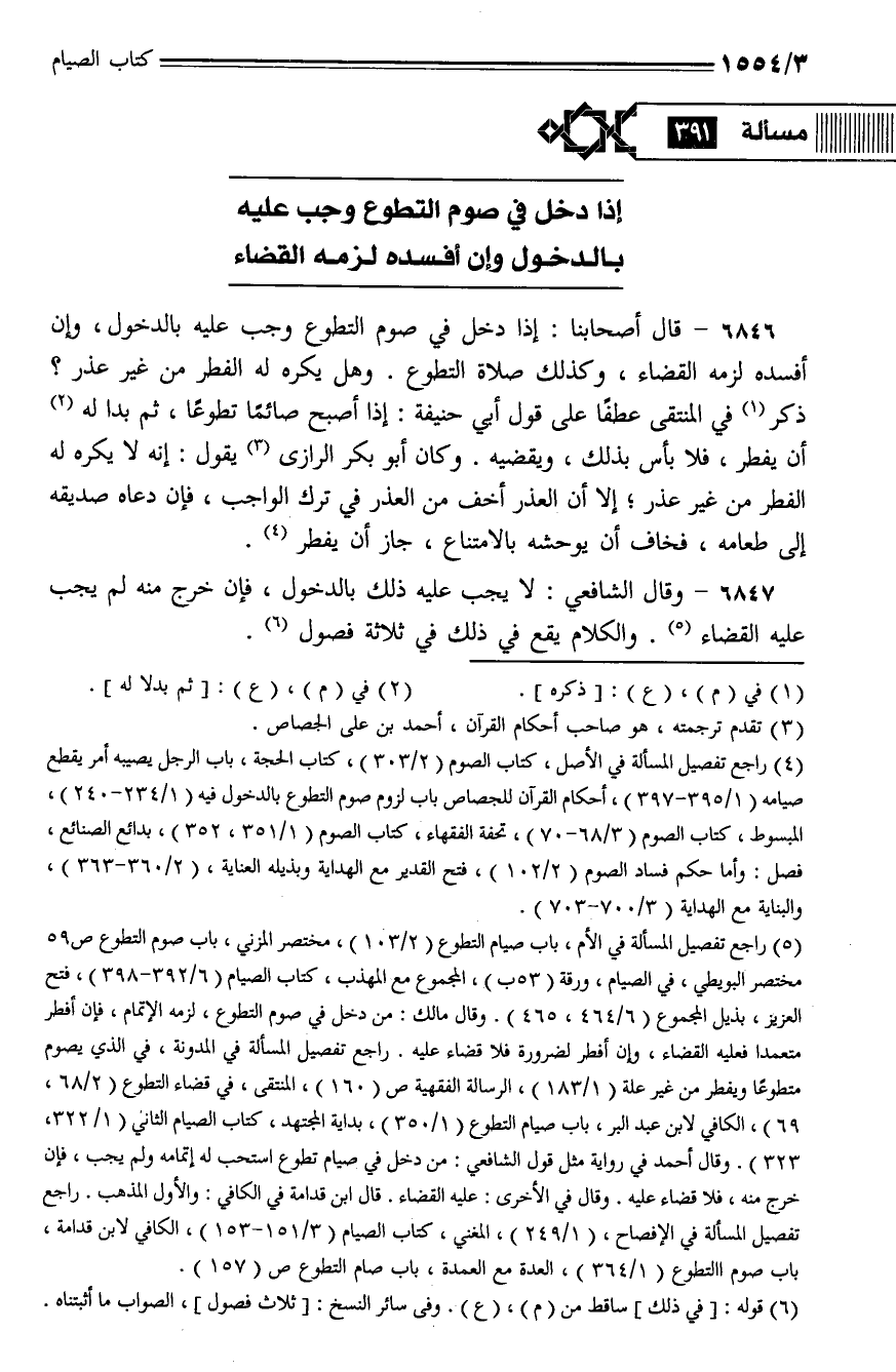 6846 - قال أصحابنا: إذا دخل في صوم التطوع وجب عليه بالدخول، وإن أفسده لزمه القضاء، وكذلك صلاة التطوع. وهل يكره له الفطر من غير عذر؟ ذكر في المنتقى عطفا على قول أبي حنيفة: إذا أصبح صائما تطوعا، ثم بدا له أن يفطر، فلا بأس بذلك، ويقضيه. وكان أبو بكر الرازي يقول: إنه لا يكره له الفطر من غير عذر؛ إلا أن العذر أخف من العذر في ترك الواجب، فإن دعاه صديقه إلى طعامه، فخاف أن يوحشه بالامتناع، جاز أن يفطر.