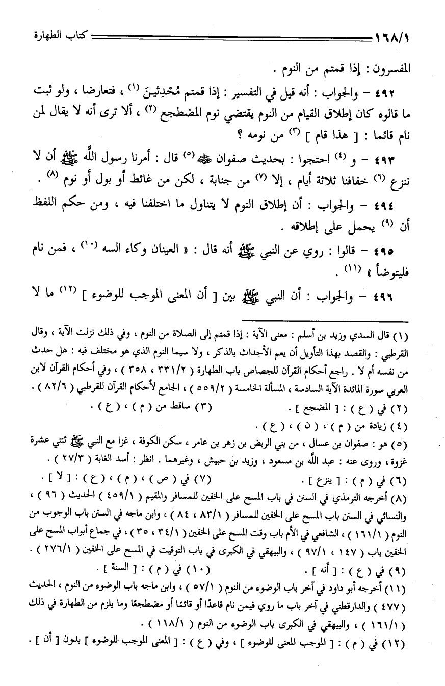 492 - والجواب: أنه قيل في التفسير: إذا قمتم مُحْدِثينَ، فتعارضا، ولو ثبت ما قالوه كان إطلاق القيام من النوم يقتضي نوم المضطجع، ألا ترى أنه لا يقال لمن نام قائمًا: هذا قام من نومه؟