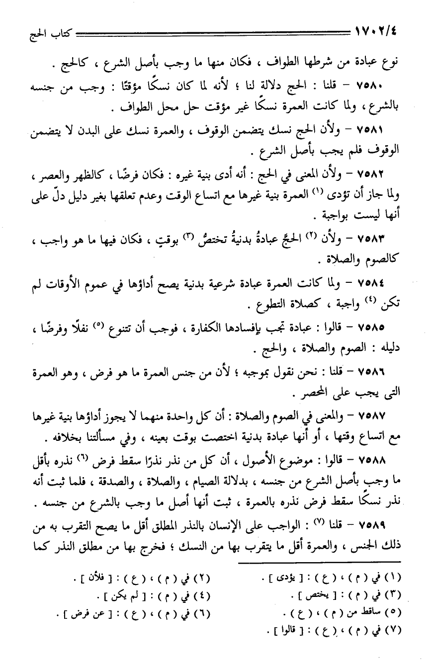 7580 - قلنا: الحج دلالة لنا؛ لأنه لما كان نسكًا مؤقتًا: وجب من جنسه بالشرع، ولما كانت العمرة نسكًا غير مؤقت حل محل الطواف.