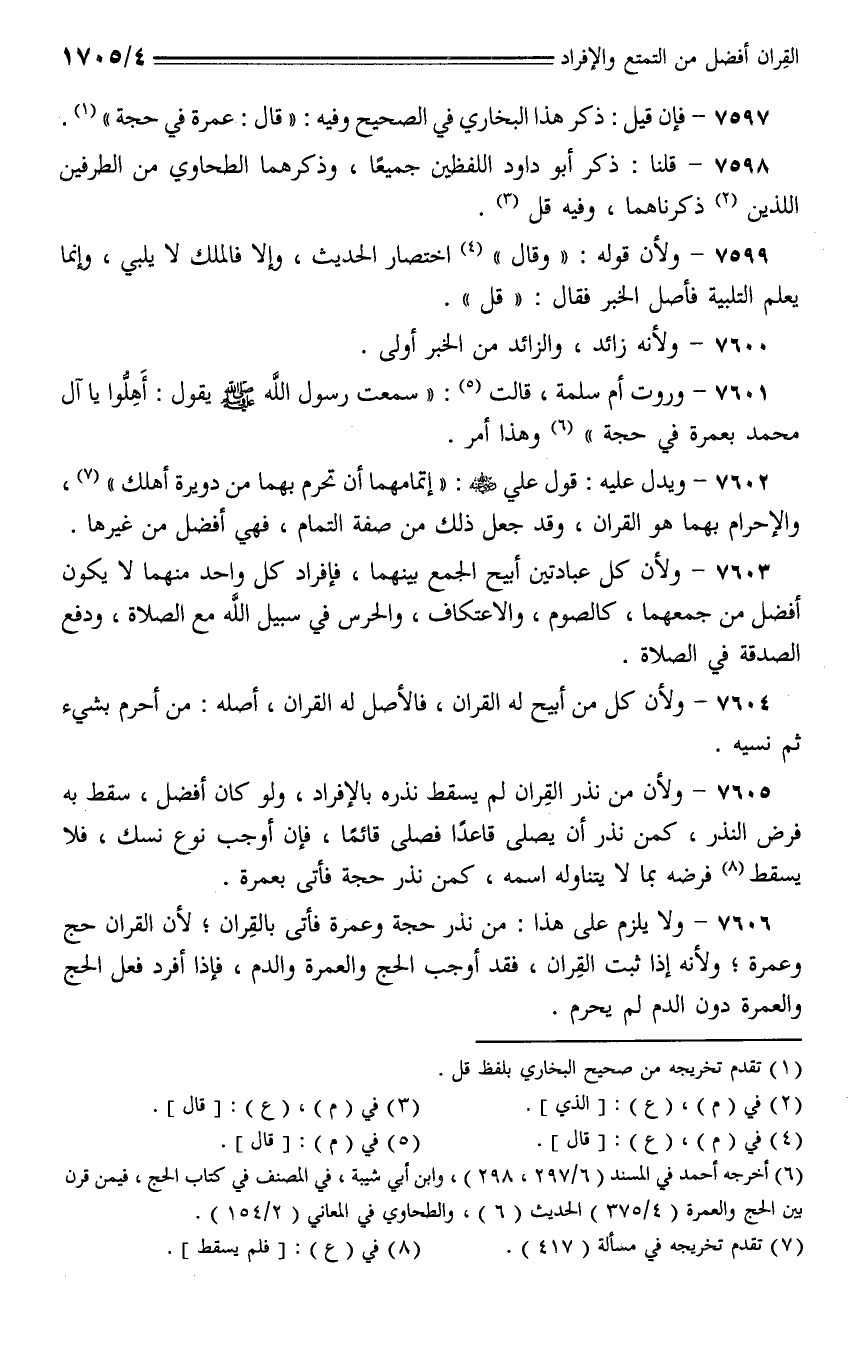 7606 - ولا يلزم على هذا: من ذنر حجة وعمرة فأتى بالقِران؛ لأن القران حج وعمرة؛ ولأنه إذا ثبت القِران، فقد أوجب الحج والعمرة والدم، فإذا أفرد فعل الحج والعمرة دون الدم لم يحرم.