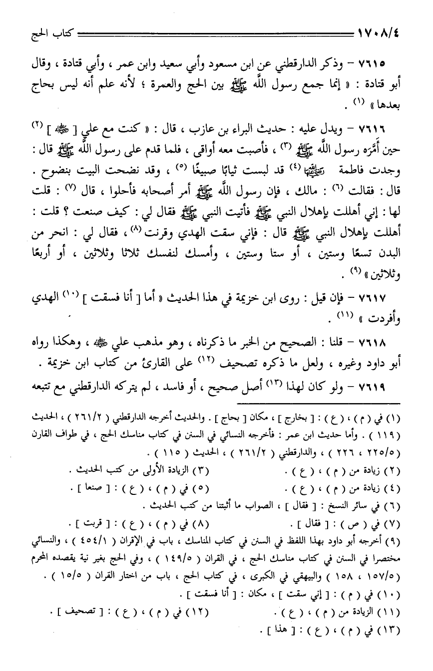 7615 - وذكر الدارقطني عن ابن مسعود وأبي سعيد وابن عمر، وأبي قتادة، وقال أبو قتادة: (إنما جمع رسول الله - صلى الله عليه وسلم - بين الحج والعمرة؛ لأنه علم أنه ليس بحاج بعدها).