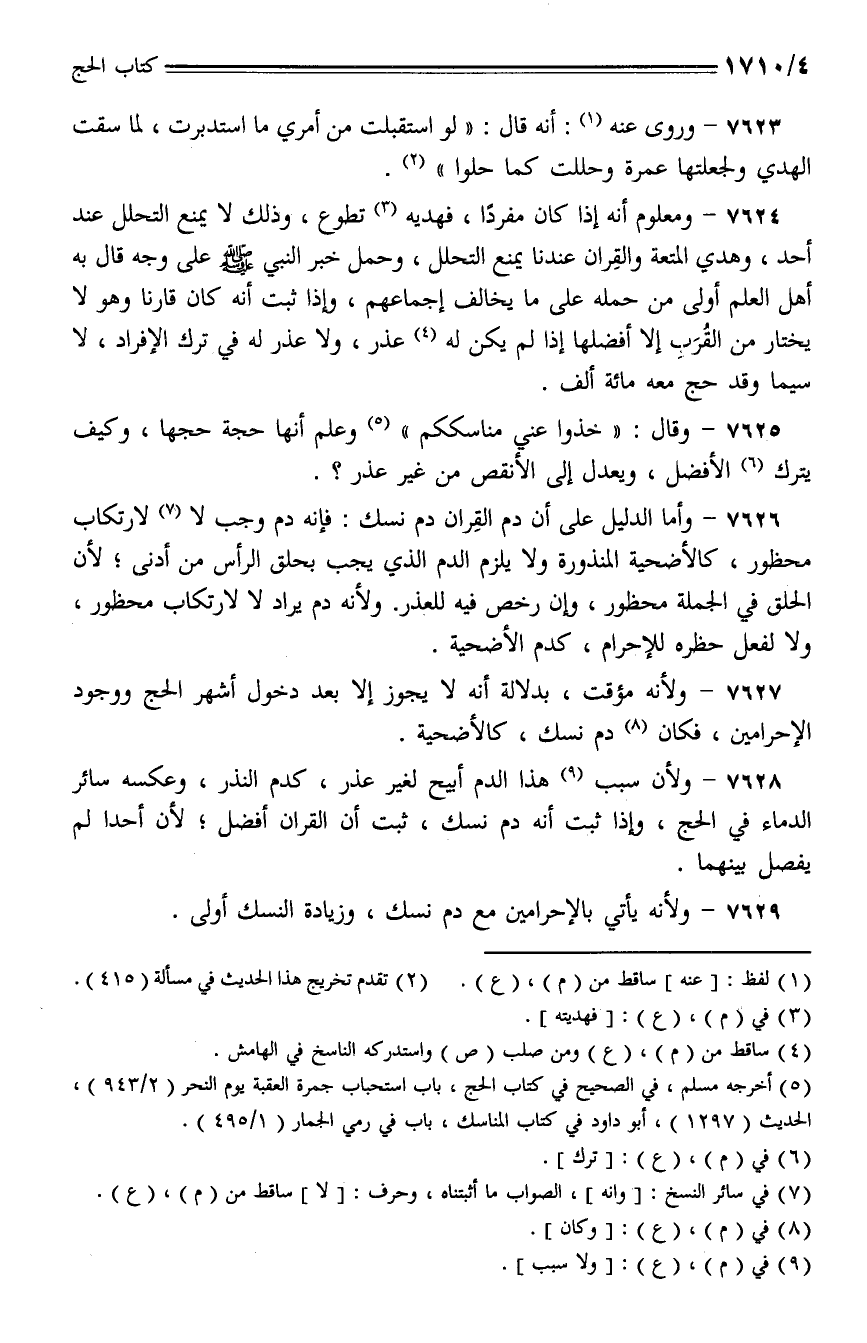 7625 - وقال: (خذوا عني مناسككم) وعلم أنها حجة حجها، وكيف يترك الأفضل، ويعدل إلى الأنقص من غير عذر؟.