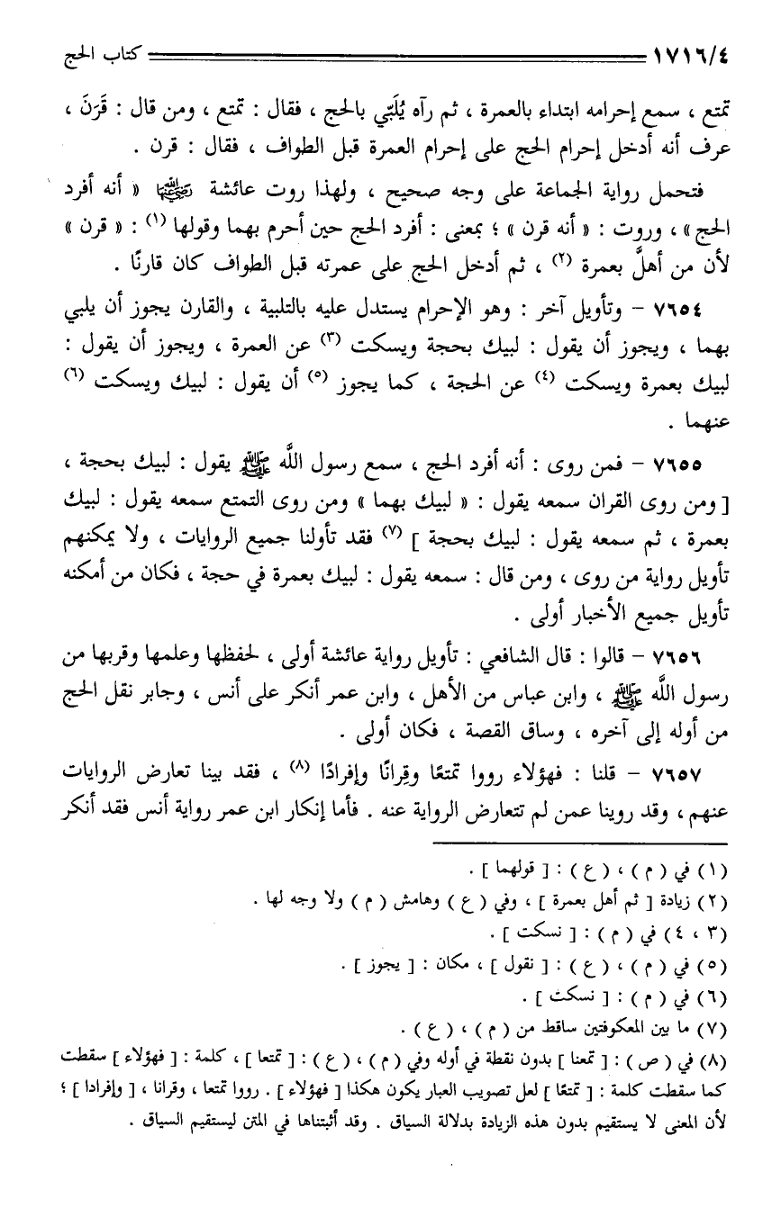 7657 - قلنا: فهؤلاء رووا تمتعًا وقِرانًا وإفرادًا، فقد بينا تعارض الروايات عنهم، وقد روينا عمن لم تتعارض الرواية عنه. فأما إنكار ابن عمر رواية أنس فقد أنكر