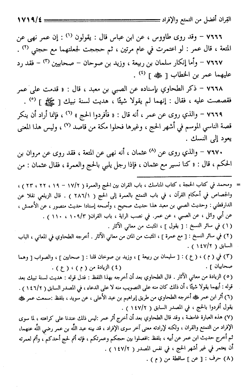 7669 - والذي روى عن عمر، أنه قال: (فأفردوا الحج)، فإنما أراد أن ينكر قصة الناسي الموسم في أشهر الحج، وغيرها فحلوا مكة من قاصد، وليس هذا المعنى يعود إلى النسك.