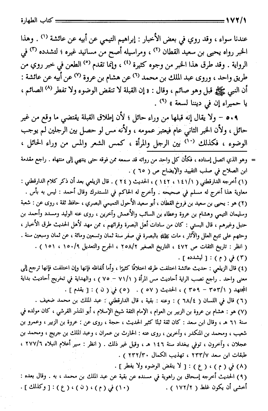 عندنا سواء، وقد روي في بعض الأخبار: إبراهيم التيمي عن أبيه عن عائشة. وهذا الخبر رواه يحيى بن سعيد القطان، ومراسيله أصح من مسانيد غيره؛ لتشدده في الرواية. وقد طرق هذا الخبر من وجوه كثيرة، وإنما تقدم الطعن في خبر روي من طريق واحد، وروى عبد الملك بن محمد عن هشام بن عروة عن أبيه عن عائشة أن النبي - صلى الله عليه وسلم - قبل وهو صائم، وقال: ((إن القبلة لا تنقض الوضوء ولا تفطر الصائم، يا حميراء إن في ديننا لسعة)).