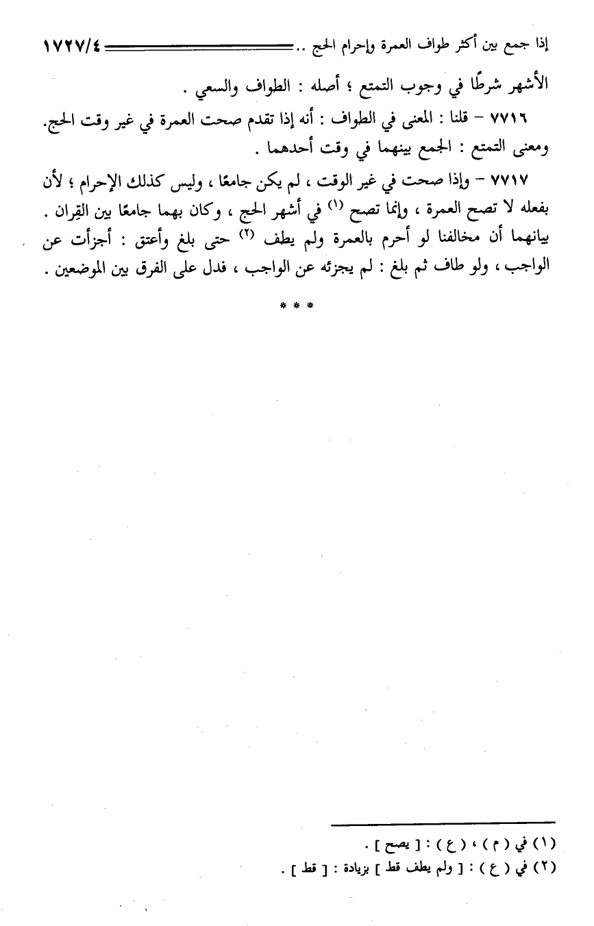 7717 - وإذا صحت في غير الوقت، لم يكن جامعًا، وليس كذلك الإحرام؛ لأن بفعله لا تصح العمرة، وإنما تصح في أشهر الحج، وكان بهما جامعًا بين القِران. بيانهما أن مخالفنا لو أحرم بالعمرة ولم يطف حتى بلغ وأعتق: أجزأت عن الواجب، ولو طاف ثم بلغ: لم يجزئه عن الواجب، فدل على الفرق بين الموضعين.