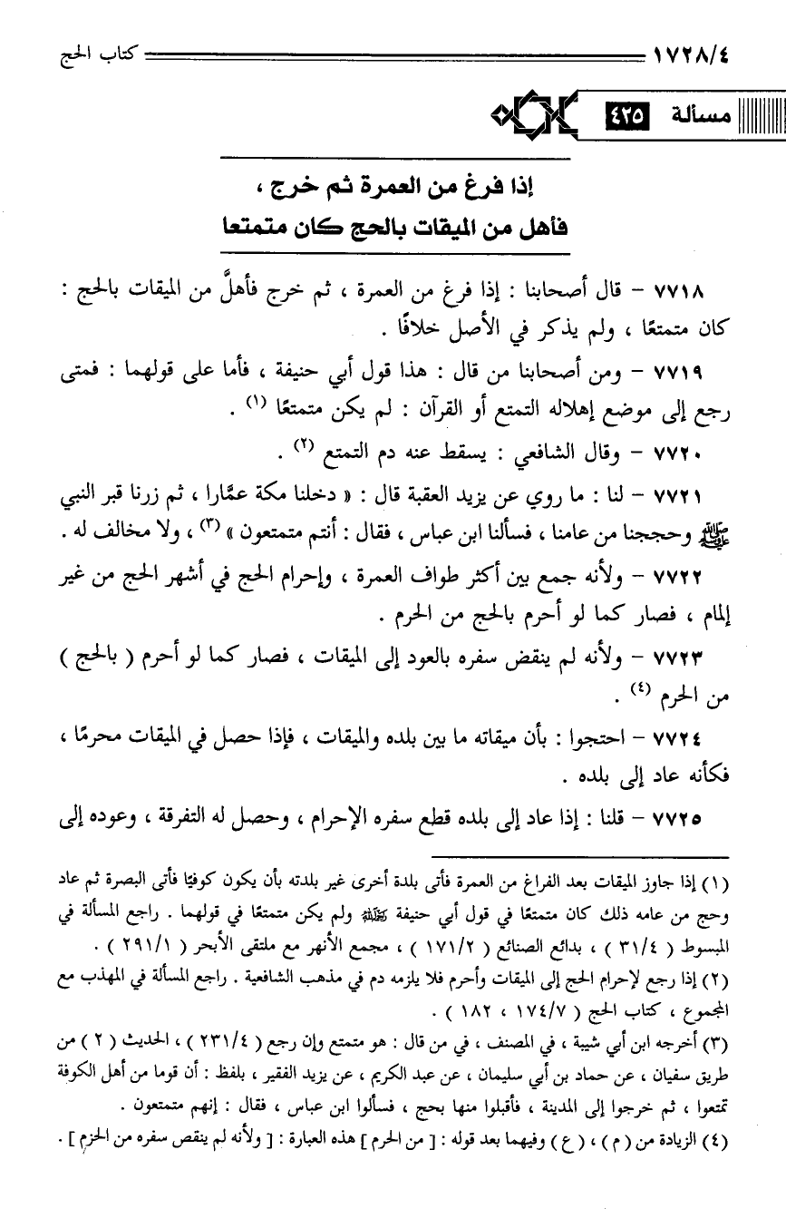 7719 - ومن أصحابنا من قال: هذا قول أبي حنيفة، فأما على قولهما: فمتى رجع إلى موضع إهلاله التمتع أو القرآن: لم يكن متمتعًا.