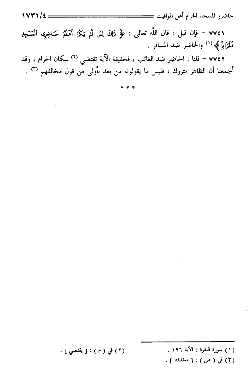 7741 - فإن قيل: قال الله تعالى: {ذلك لمن لم يكن أهله حاضري المسجد الحرام} والحاضر ضد المسافر.