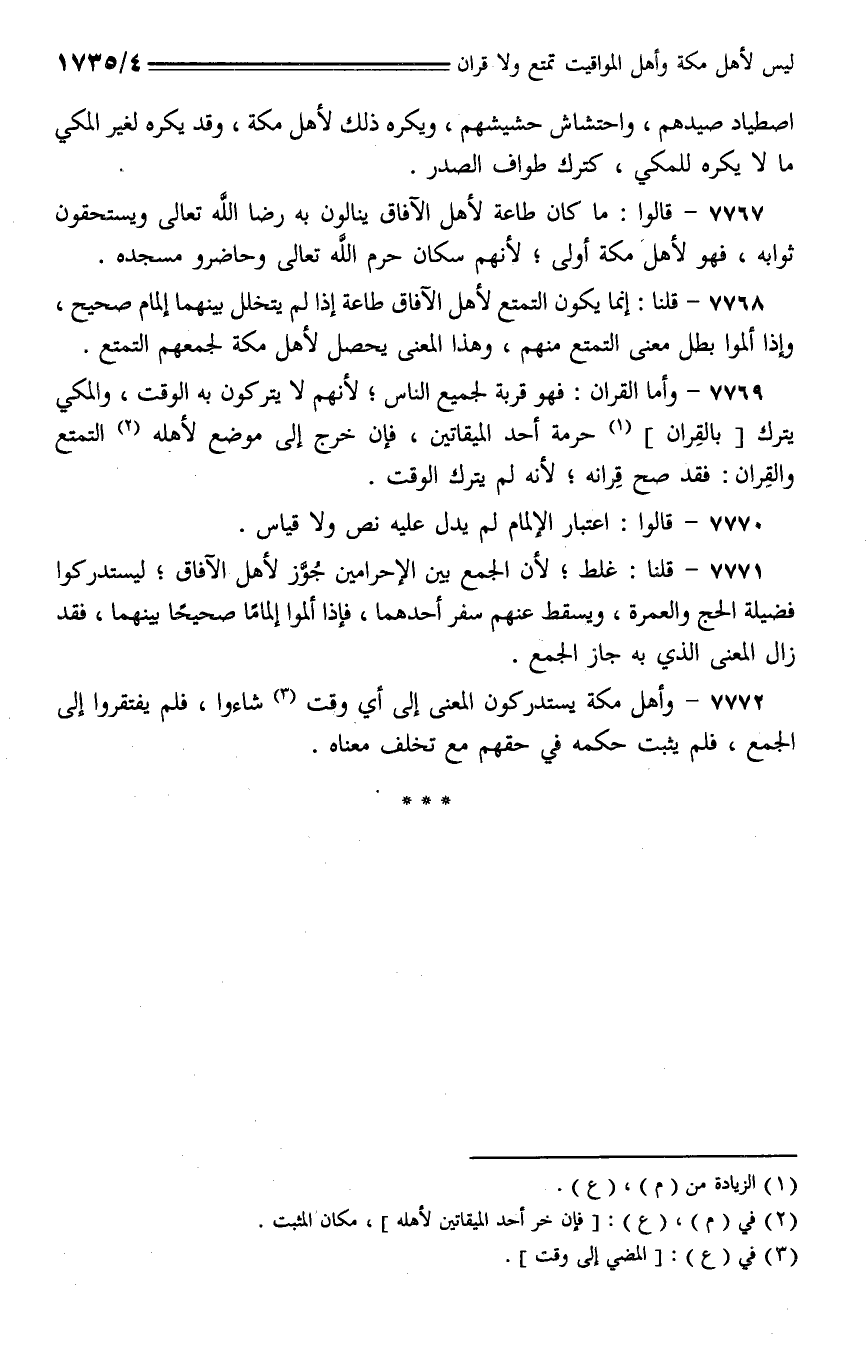 7768 - قلنا: إنما يكون التمتع لأهل الآفاق طاعة إذا لم يتخلل بينهما إلمام صحيح، وإذا ألموا بطل معنى التمتع منهم، وهذا المعنى يحصل لأهل مكة لجمعهم التمتع.