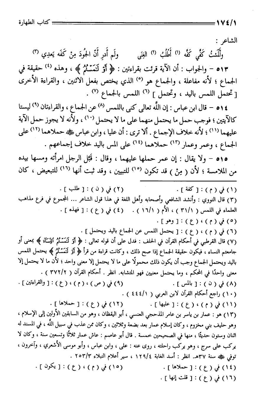 513 - والجواب: أن الآية قرئت بقراءتين: {أو لامستم}، وهذه حقيقة في الجماع؛ لأنه مفاعلة، والجماع هو الذي يختص بفعل الاثنين، والقراءة الأخرى تحتمل اللمس باليد، وتحتمل اللمس بالجماع.